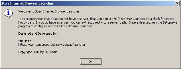 Local Only (or Standalone) Install - This is normally performed at each computer from a floppy disk (i.e. download the Launcher from this website and extract it to a floppy disk before using). This type of installation is recommended where there is no server in your school, or if you'd like to use Stu's Internet Browser Launcher at home with dial-up Internet access. NOTE that there is no ability to stop Internet access using Stu's Internet Switch utility.