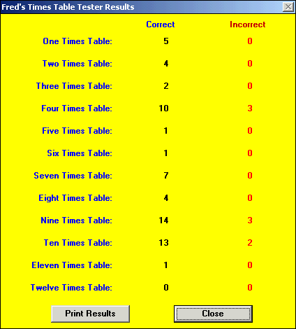 At the end of each session a report is displayed which can be printed showing how many questions were attempted in each times table and how many attempts were answered both correctly and incorrectly.